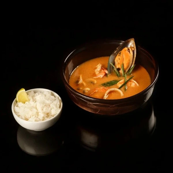Рыба Треска , Креветки , Мидии , Кальмар , Соевый соус на основе краба , Редька дайкон , Кочюдян , Хондаши , Чеснок , Лук белый , Морковь , Рис , Норри , Пекинская капуста , Лук зеленый , Хемультан» — корейский суп из морепродуктов !!!Суп-пикантный с остринкой!!!